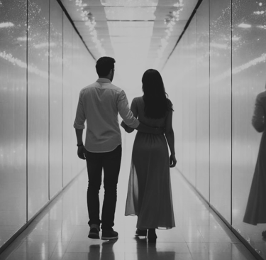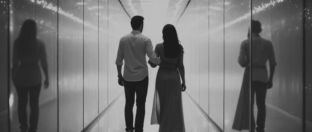 Still lost in the moment, he puts an arm around her shoulder as they walk through the maze. With every turn, their reflections appear everywhere, showing their laughter, teasing, and stolen looks.